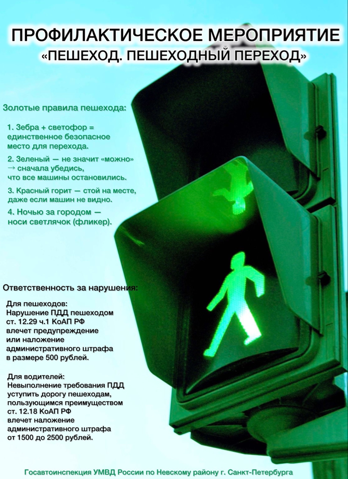 В целях предупреждения дорожно-транспортных происшествий с участием пешеходов и усиления контроля за соблюдением водителями Правил дорожного движения, в частности правил проезда нерегулируемых пешеходных переходов, с 16 по 19 апреля 2026 года на территории Невского района Санкт-Петербурга будет проводиться профилактическое мероприятие «Пешеход. Пешеходный переход».